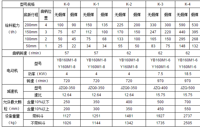 注釋:K型往復(fù)式給料機(jī)可以調(diào)節(jié)曲柄位置,從而調(diào)節(jié)底板行程而達(dá)到調(diào)節(jié)給料量,表中所列的給料能力是每種機(jī)型在該行程時(shí)并且調(diào)節(jié)閘門(mén)調(diào)到大狀態(tài)時(shí)的給料量。